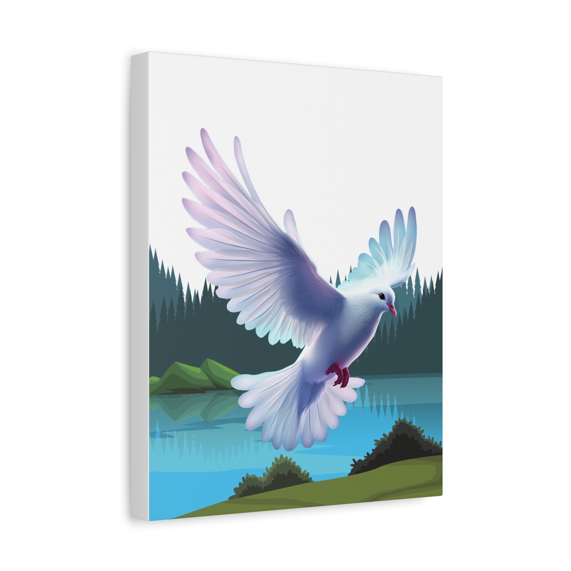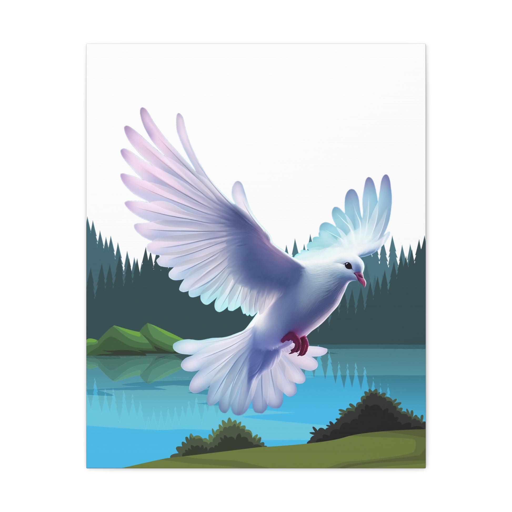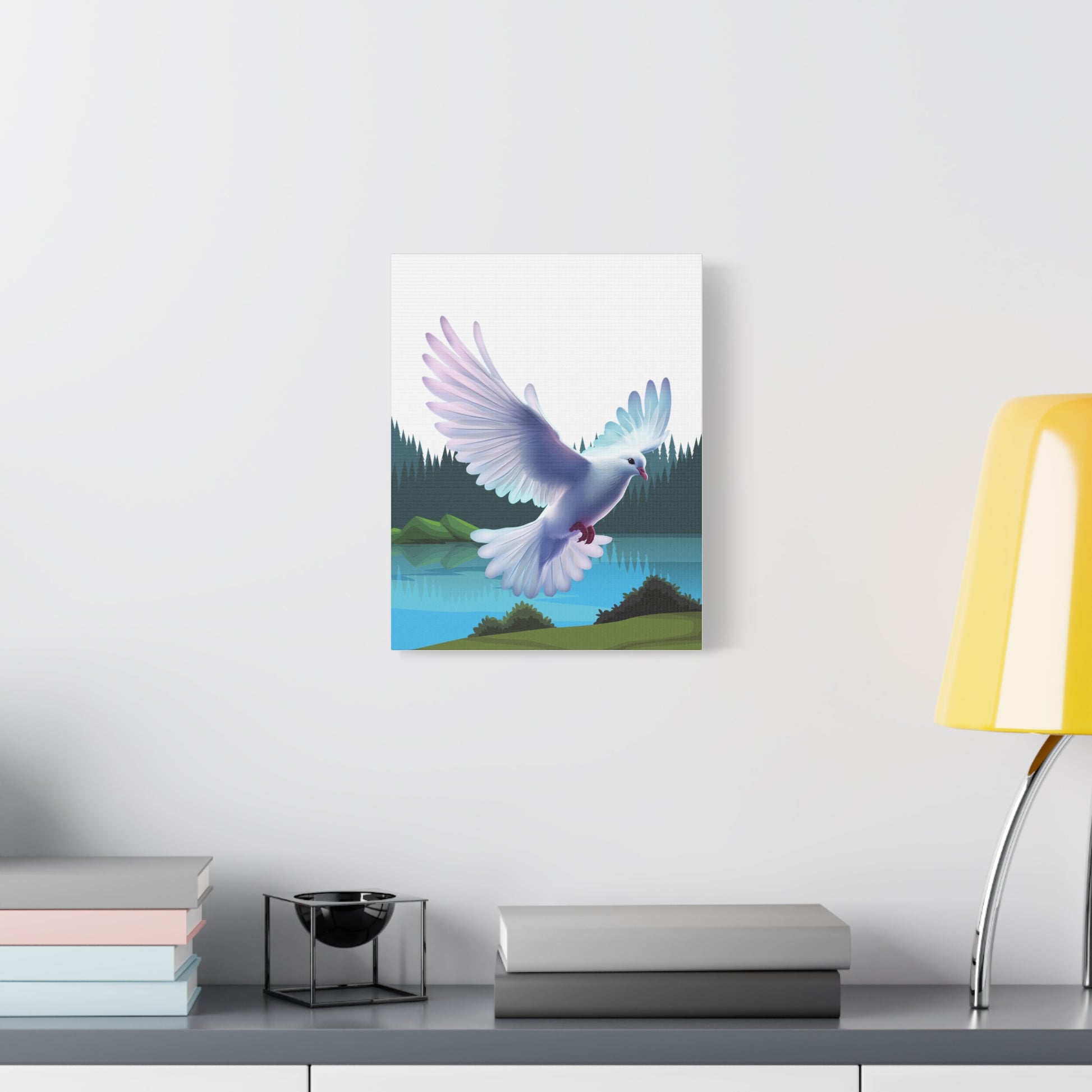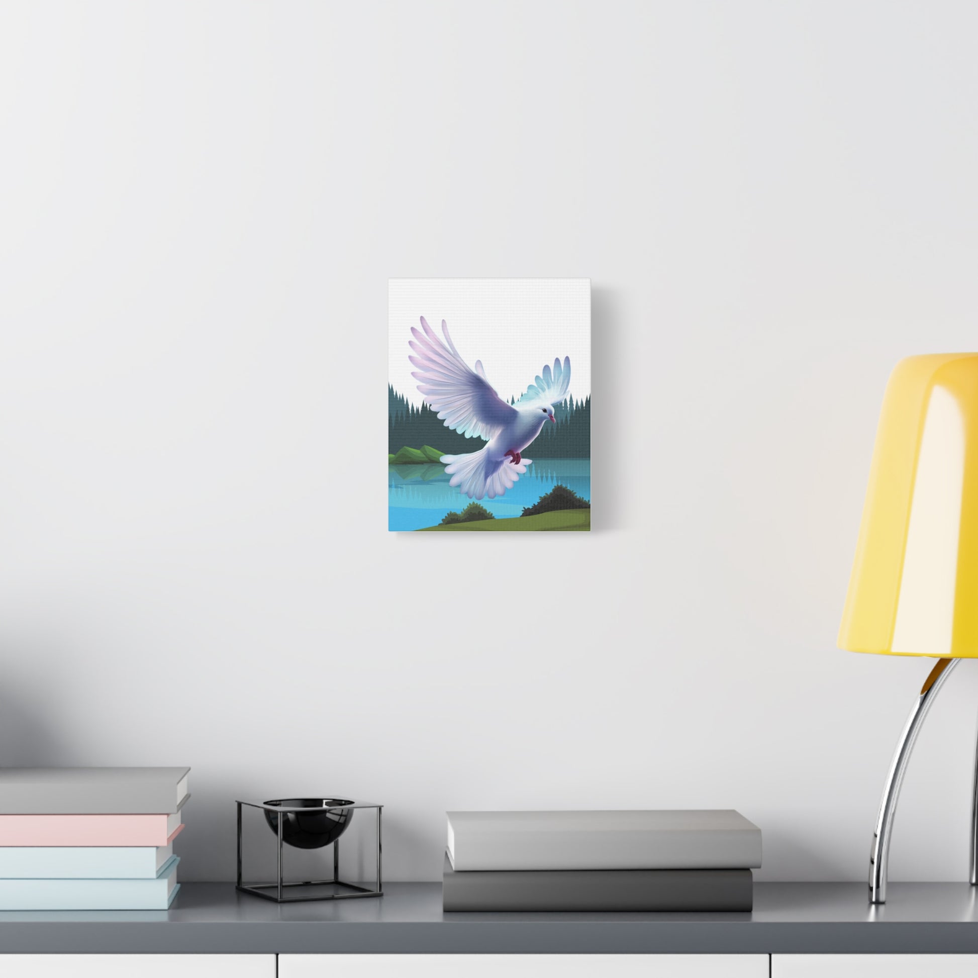 Un imprimé sur toile mate apaisant qui apporte un moment de quiétude dans n'importe quelle pièce. Des couleurs douces et picturales capturent la colombe du Saint-Esprit descendant au-dessus d'un lac de montagne immobile, encadré par des pins vert foncé et des collines brumeuses. Le bord tendu de 1,25" offre un profil net, prêt pour une galerie, qui flotte au-dessus du mur et laisse l'art respirer. Accrochez-le au-dessus d'un coin lecture, dans un espace de méditation ou sur un mur de chambre pour inviter un sentiment de calme et de mouvement doux dans la vie quotidienne.