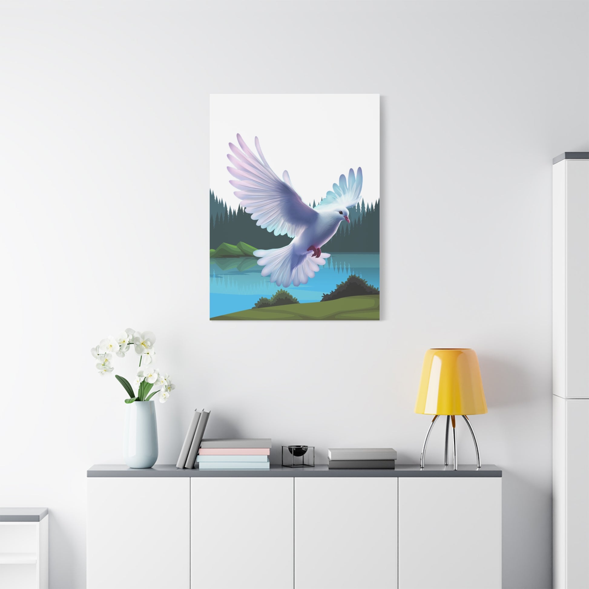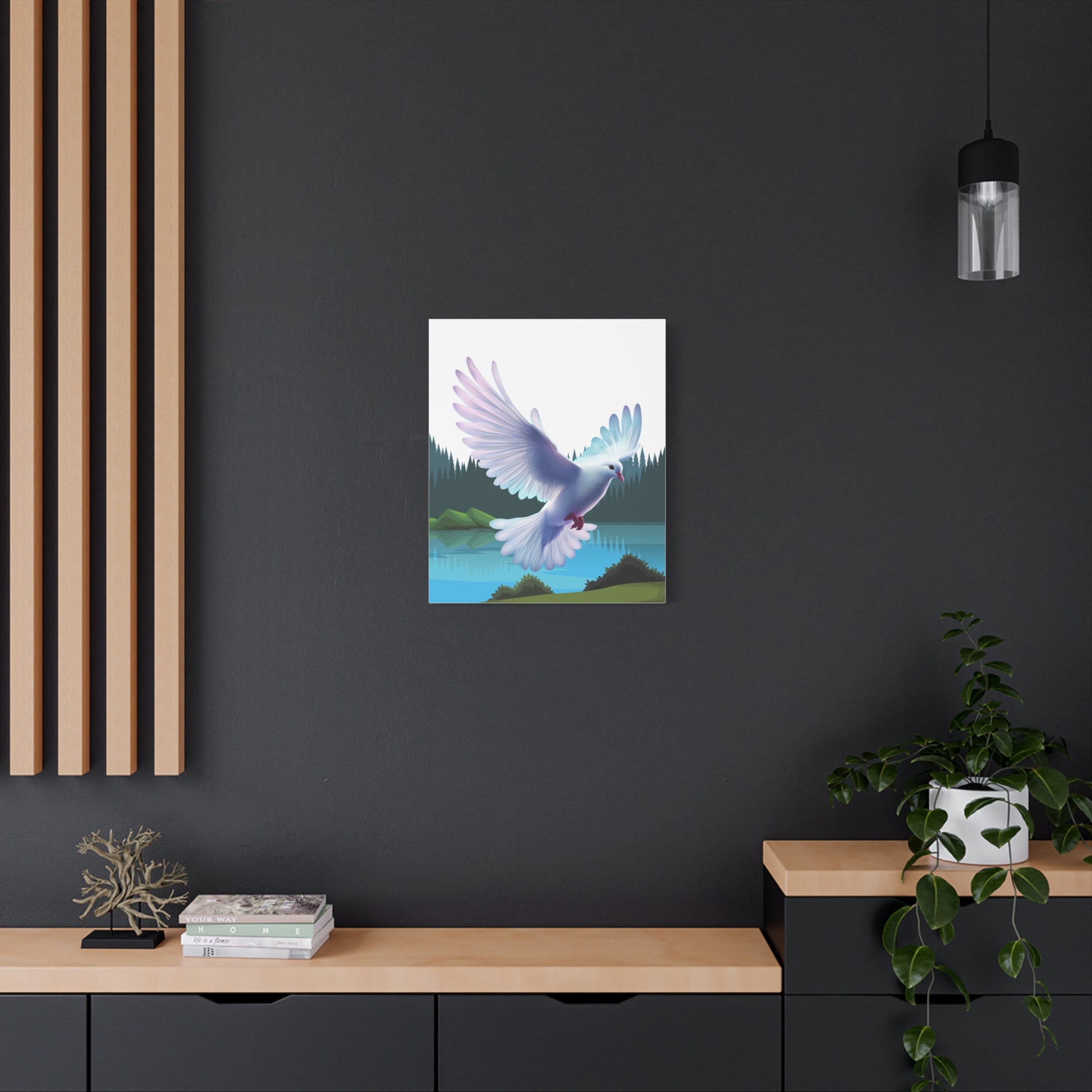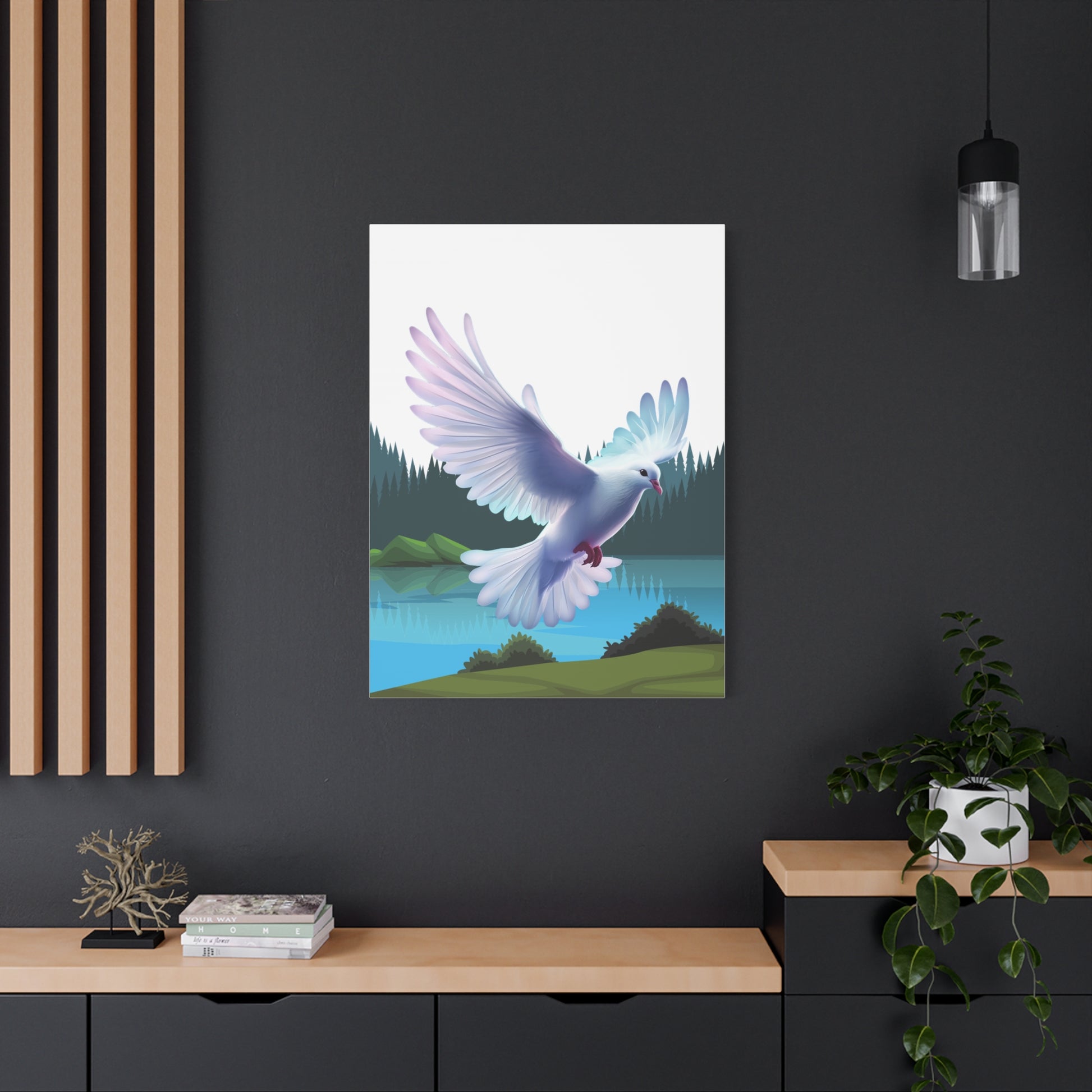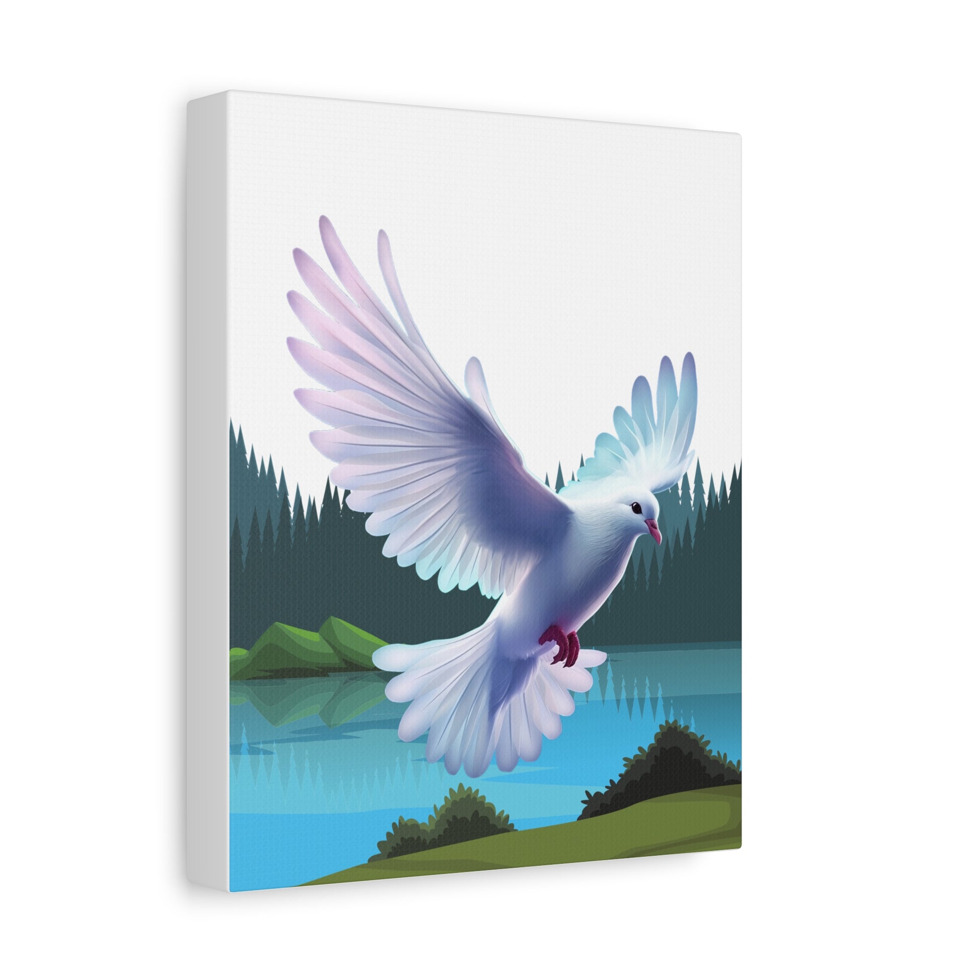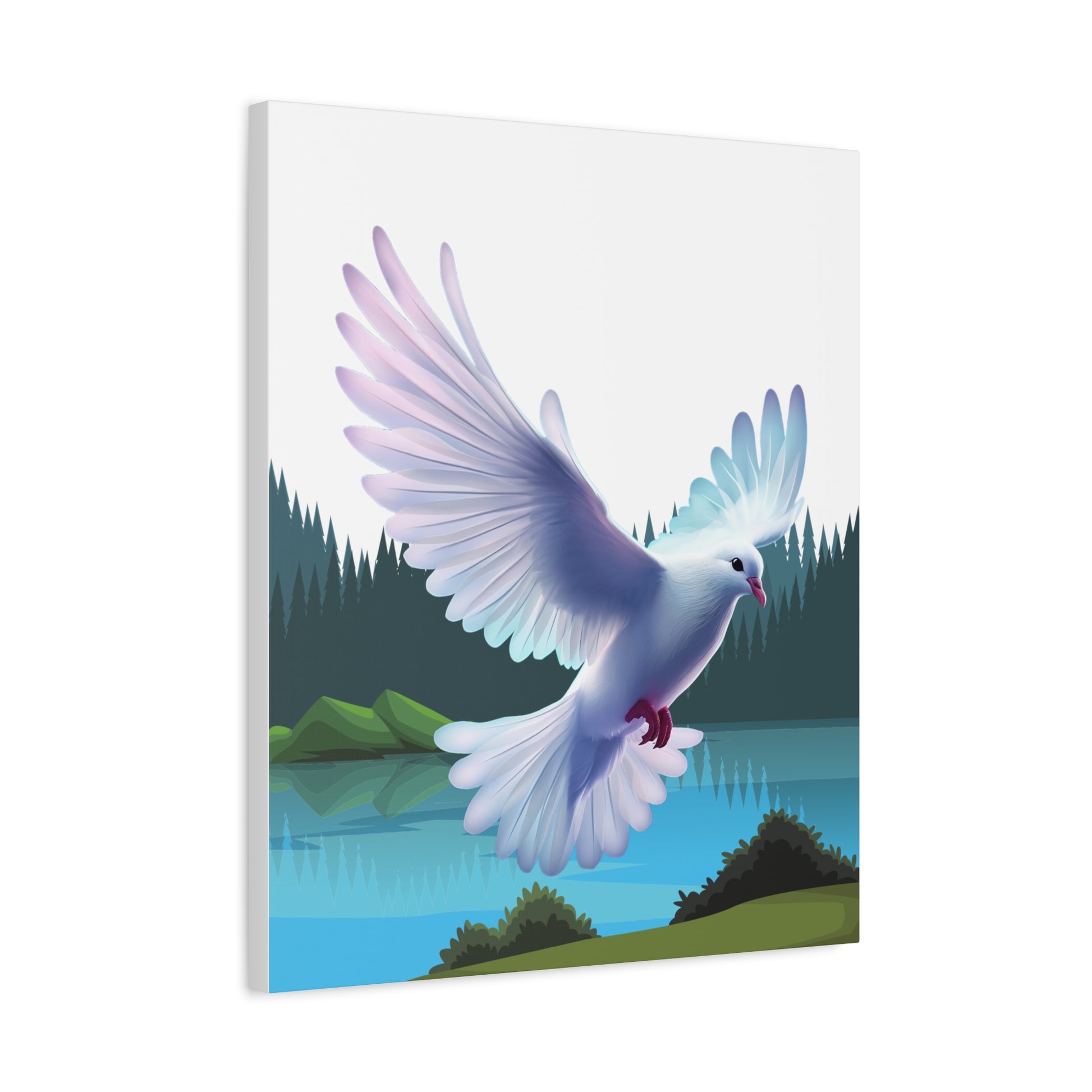 Un imprimé sur toile mate apaisant qui apporte un moment de quiétude dans n'importe quelle pièce. Des couleurs douces et picturales capturent la colombe du Saint-Esprit descendant au-dessus d'un lac de montagne immobile, encadré par des pins vert foncé et des collines brumeuses. Le bord tendu de 1,25" offre un profil net, prêt pour une galerie, qui flotte au-dessus du mur et laisse l'art respirer. Accrochez-le au-dessus d'un coin lecture, dans un espace de méditation ou sur un mur de chambre pour inviter un sentiment de calme et de mouvement doux dans la vie quotidienne.
